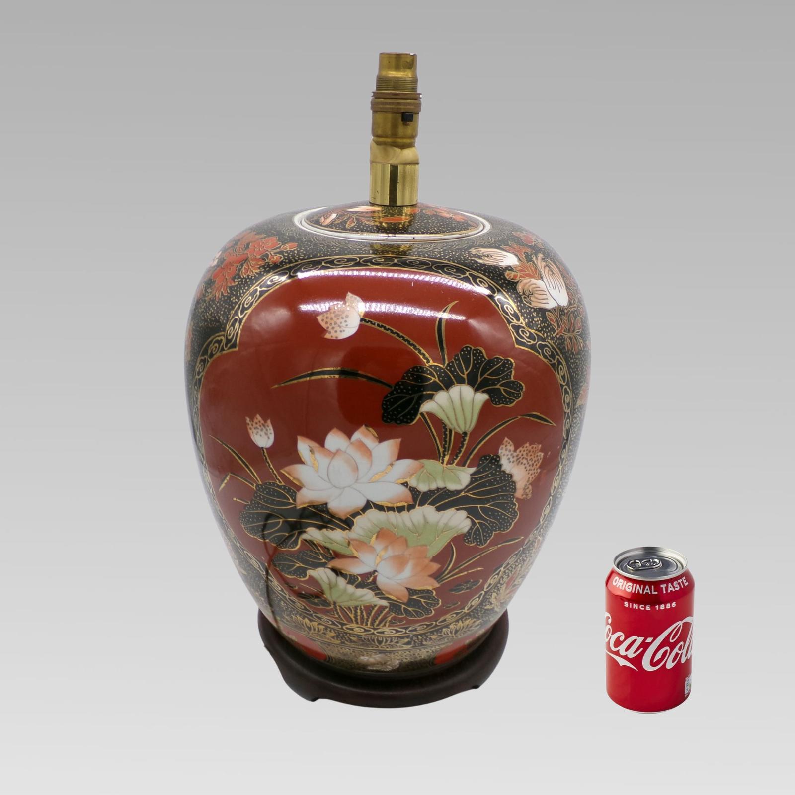 Large Red Floral Vintage Chinese Oriental Satsuma Style Bulbous Vase Table Lamp